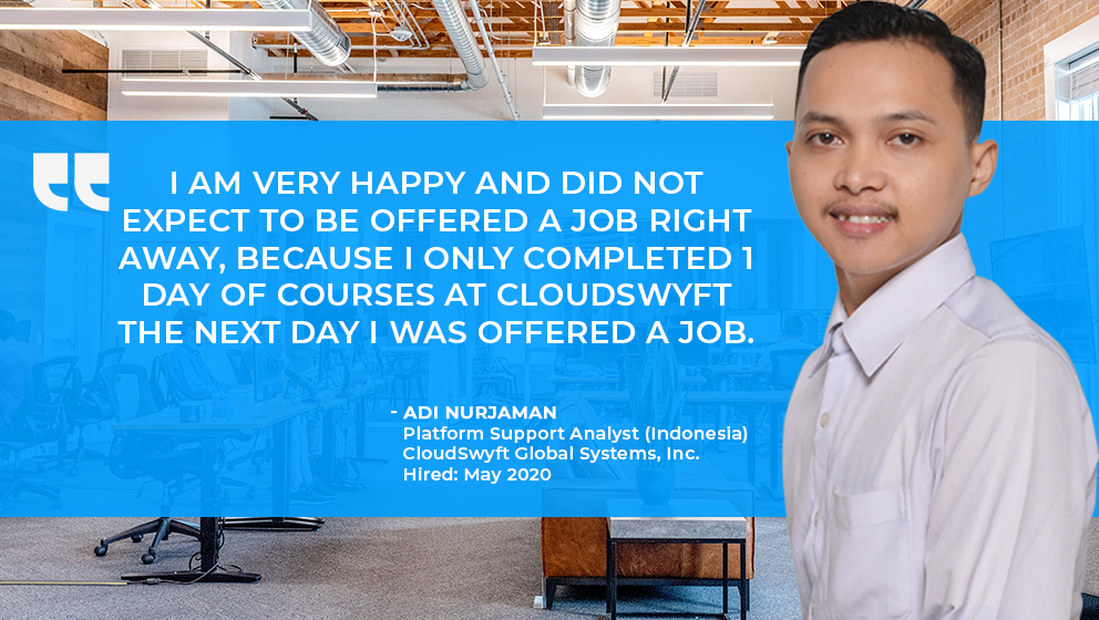 With his certificate, was a surprise waiting for Adi. He got a call from non-other than CloudSwyft Founder and CEO, Dann Angelo De Guzman, congratulating him on his near perfect exam result. It was fate that brought Adi to the Kartu Prakerja project, and within CloudSwyft’s range as the company was looking to expand in the Indonesian Education Technology Market. Adi was the best candidate to fill the Platform Support Analyst that the company was looking to fill. He was both surprised and happy that a job was offered in the field he wanted to go to, IT, as his major.